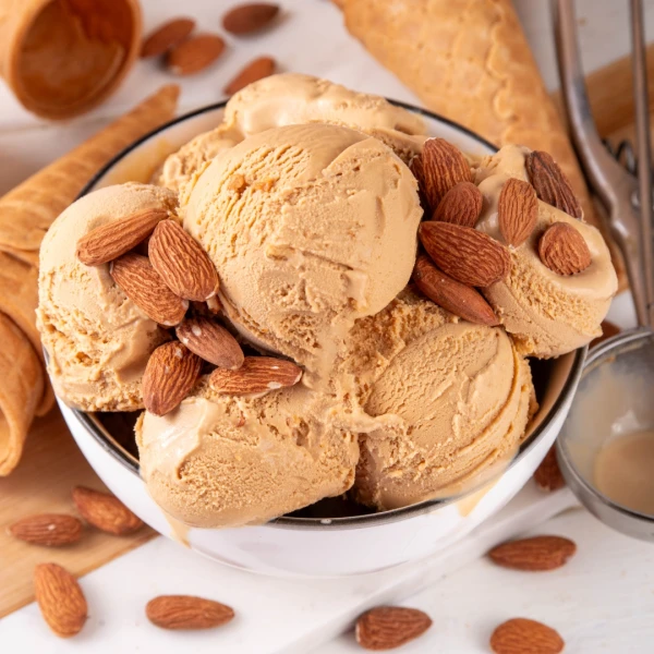 نقدم كرات الآيس كريم مع تغطيتها باللوز المطحون.