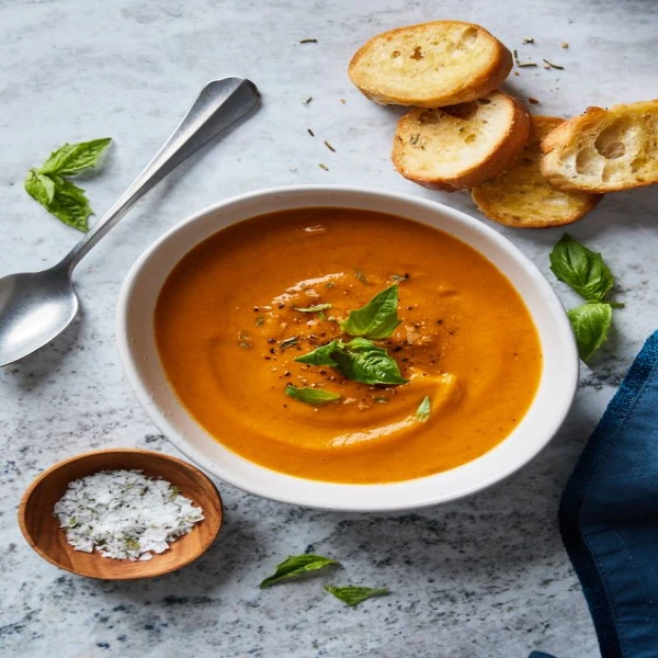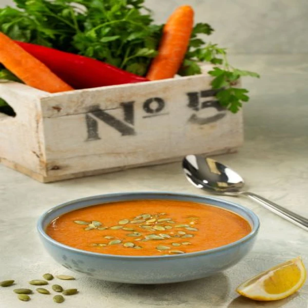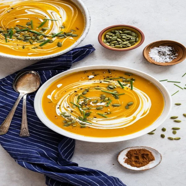 نخلط جميع مكونات الشوربة بالخلاط و نقدمها مع بذور عباد الشمس وبذور اليقطين.