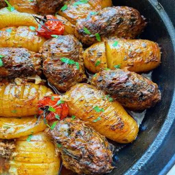 نخرج الصينية من الفرن، ونضع فوقها شرائح الطماطم. والبطاطس